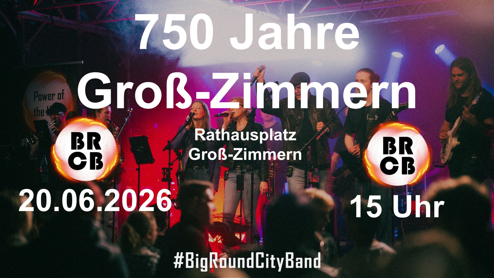 Anlässlich des 750-jährigen Jubiläums von Groß-Zimmern sorgt die BigRoundCityBand am 20. Juni 2026 von 15:00 bis 17:00 Uhr für musikalische Unterhaltung auf dem Festgelände.