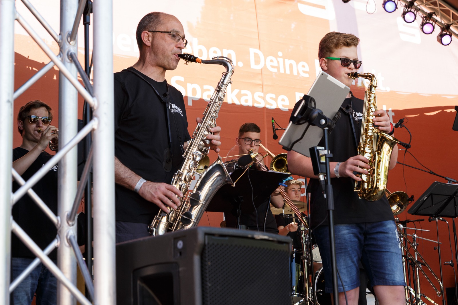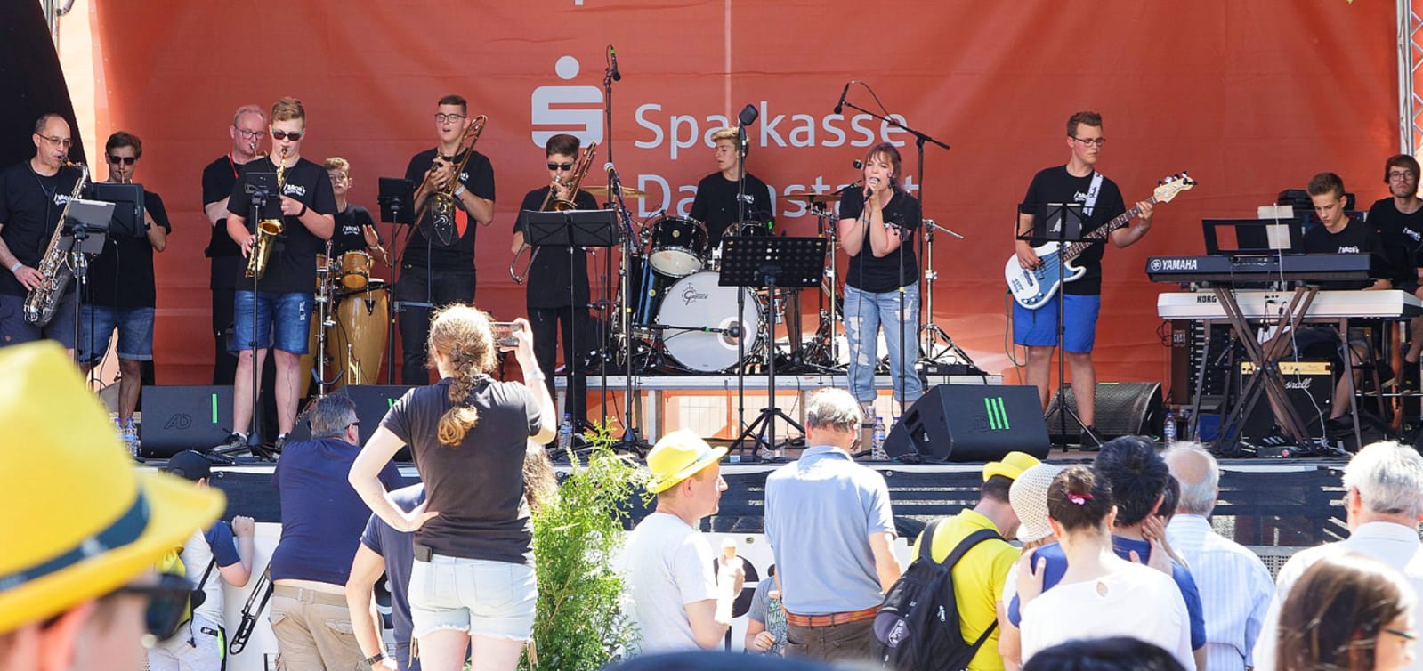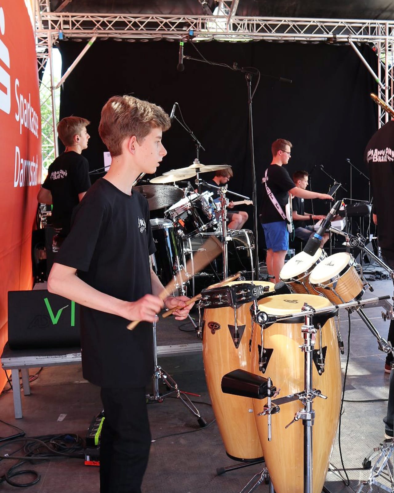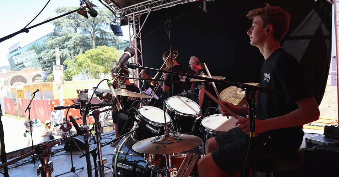 Der Auftrittstag verlief dann erstaunlich entspannt. Wir konnten mit unseren Autos auf das Festival-Gelände fahren (Wie cool ist das denn bitte?), hatten genug Zeit zum Aufbauen und zwischendurch sogar Zeit für den ein oder anderen Spaß. Lediglich das heiße Wetter sorgte für Zweifel, ob überhaupt Publikum kommen würde. Die waren aber unberechtigt. Um Punkt 13 Uhr wurden wir belohnt: Im Schatten vor der Bühne versammelten sich viele Menschen, um mit uns zu feiern! Es war so ein tolles Publikum, dass bei uns für so viel Spaß sorgte, dass die 45 Minuten wie im Flug vergingen. Und so spielten wir unsere liebsten Lieder, gingen sogar kurz ins Publikum, um mit ihnen zum Schlagzeug-Solo zu klatschen und genossen diese super Zeit.